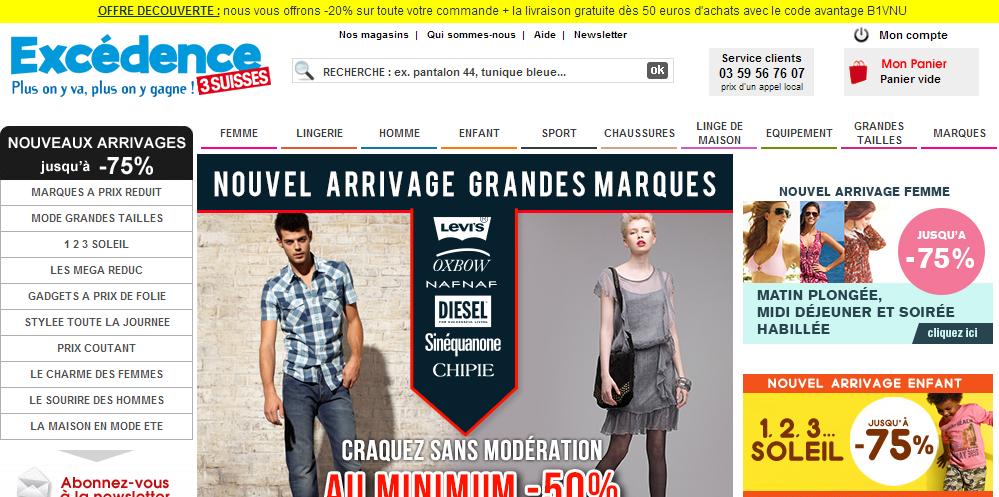 Excédence est un site de déstockage 3 suisses, vous y trouverez une rubrique tout à 2 € , ainsi que des bonnes affaires à prix sacrifié jusqu'à - 90 %